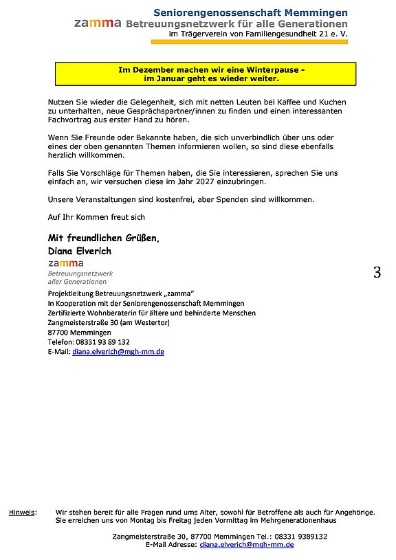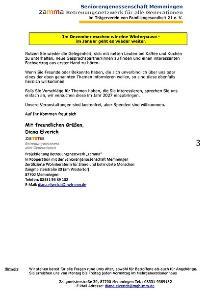 Das MehrGenerationenHaus ist vom 22.12.–7.1. geschlossen, die Nachbarschaftshilfe Zamma ist auch zwischen den Feiertagen erreichbar.